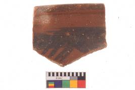 | Description / विवरण | Specimen of potsherd with black decorative geometric Linear painting, Type Black on Red Ware . |