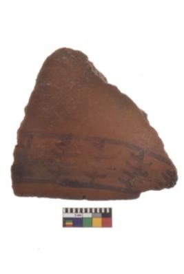 | Description / विवरण | Specimen of black on red ware with decorative geometric slanting lines in two registers stroked slantingly painting. |