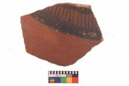 | Description / विवरण | Specimen of potsherd with black decorative geometric Linear painting, Type Black on Red Ware . |