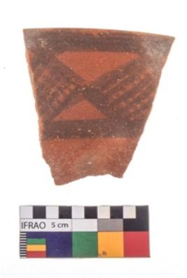 | Description / विवरण | Specimen of potsherd with black decorative geometric diamond set broad horizontal bands painting . |