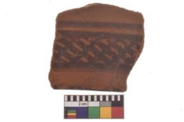 | Description / विवरण | Specimen of black on red ware with decorative geometric diagonal lattice between bands painting. |