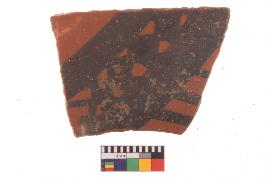 | Description / विवरण | Specimen of potsherd with black decorative geometric Diamond set broad horizontal bands painting, Type Black on Red Ware . |