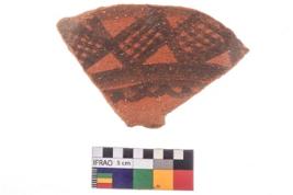 | Description / विवरण | Specimen of Potsherd with black decorative geometric diamond set broad horizontal bands painting . |
