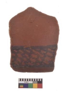 | Description / विवरण | Specimen of black on red ware with decorative geometric diagonal lattice between bands painting. |