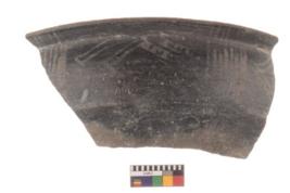 | Description / विवरण | Specimen of black ware with creamish decorative Parallel and criss cross lines geometric painting. |