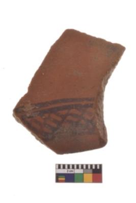 | Description / विवरण | Specimen of black on red ware with decorative geometric flag design painting. |