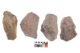 | Description / विवरण | These are n 4 of worked tools. They are tapering at one end and have sharp edges. They have round base and show dominant irregular scar pattern. |