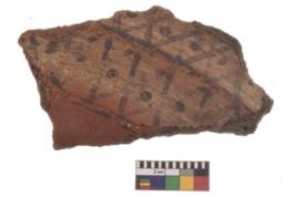 | Description / विवरण | Specimen of black on red ware with decorative geometric double register of lozenges with dots painting. |