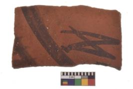 | Description / विवरण | Specimen of black on red ware with decorative geometric an hour glass pattern painting. |