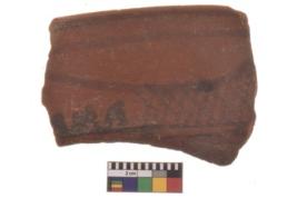 | Description / विवरण | Specimen of black on red ware with traces of decorative geometric two horizontal bands containing criss-cross pattern painting. |