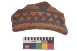 | Description / विवरण | Specimen of black on red ware with decorative geometric A row of arches over a horizontal band painting. |