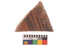 | Description / विवरण | Specimen of potsherd with black decorative geometric Linear painting, Type Black on Red Ware . |