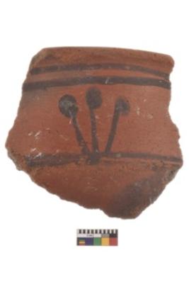 | Description / विवरण | Specimen of black on red ware with decorative geometric Triple match-stick design painting. |