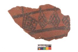| Description / विवरण | Specimen of potsherd with black decorative geometric Diamond set broad horizontal bands painting, Type Black on Red Ware . |