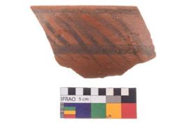 | Description / विवरण | Specimen of potsherd black on red painted pottery. It is fine fabric in sharp contrast with painted design are executed in black pigment. |