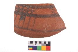 | Description / विवरण | Specimen of potsherd with black decorative geometric Diamond set broad horizontal bands painting, Type Black on Red Ware . |