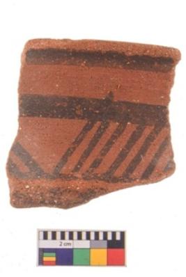 | Description / विवरण | Specimen of potsherd black on red painted pottery. It is fine fabric in sharp contrast with painted design are executed in black pigment. |