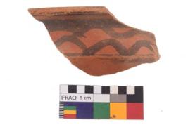 | Description / विवरण | Specimen of potsherd black on red painted pottery. It is fine fabric in sharp contrast with painted design are executed in black pigment. |