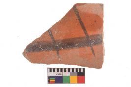 | Description / विवरण | Specimen of potsherd with black decorative geometric Linear painting, Type Black on Red Ware . |