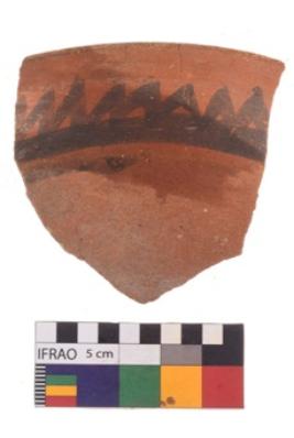 | Description / विवरण | Specimen of potsherd black on red painted pottery. It is fine fabric in sharp contrast with painted design are executed in black pigment. |