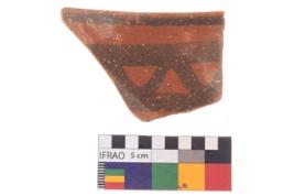 | Description / विवरण | Specimen of potsherd black on red painted pottery. It is fine fabric in sharp contrast with painted design are executed in black pigment. |