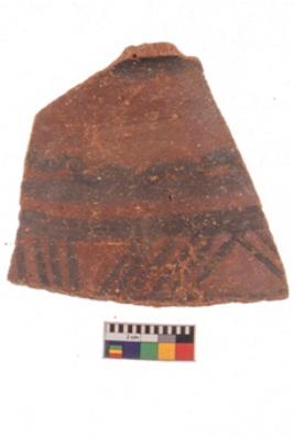 | Description / विवरण | Specimen of potsherd black on red painted pottery. It is fine fabric in sharp contrast with painted design are executed in black pigment. |