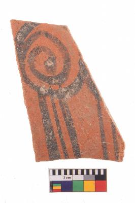 | Description / विवरण | Specimen of Potsherd black on red painted pottery. It is fine fabric in sharp contrast with painted design are executed in black pigment. |