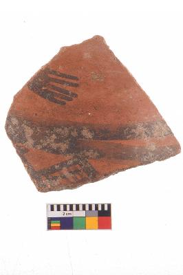 | Description / विवरण | Specimen of Potsherd black on red painted pottery. It is fine fabric in sharp contrast with painted design are executed in black pigment. |
