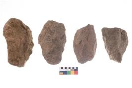 | Description / विवरण | These are n 4 of worked tools. They are tapering at one end and have sharp edges. They have round base and show dominant irregular scar pattern. |