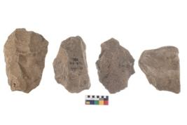 | Description / विवरण | These are n 4 of worked tools. They are tapering at one end and have sharp edges. They have round base and show dominant irregular scar pattern. |