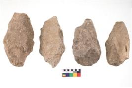 | Description / विवरण | These are n 4 of worked tools. They are tapering at one end and have sharp edges. They have round base and show dominant irregular scar pattern. |