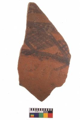 | Description / विवरण | Specimen of potsherd with black decorative geometric Diamond set broad horizontal bands painting, Type Black on Red Ware . |