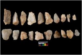 | Description / विवरण | There are n 20 flakes; the flakes are with marginal retouch . The flakes have a flat dorsal surface, and double rigdes going parallel to its length. |