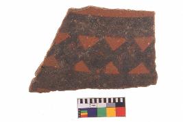 | Description / विवरण | Specimen of potsherd with black decorative geometric Diamond set broad horizontal bands painting, Type Black on Red Ware . |