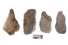 | Description / विवरण | These are n 4 of worked tools. They are tapering at one end and have sharp edges. They have round base and show dominant irregular scar pattern. |