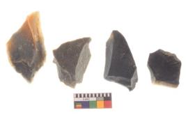 | Description / विवरण | There are n 4 utilized worked flakes; they show multidirectional irregular scar pattern on both dorsal and ventral face of the flakes.Three are tapering at one end and having sharp edges. |