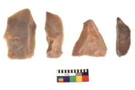 | Description / विवरण | There are n 4 utilized flake cores. There are multidirectional irregular scar pattern on both dorsal and ventral face of the flake cores. One is tapering at one end and three have sharp edges. |