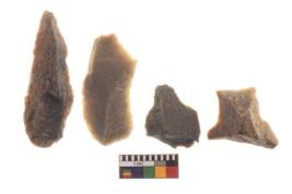 | Description / विवरण | There are n 4 utilized worked flakes; they show multidirectional irregular scar pattern on both dorsal and ventral face of the flakes.Two are tapering at one end and having sharp edges. |