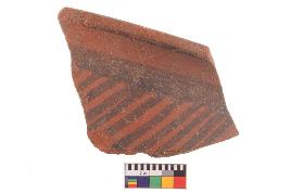 | Description / विवरण | Specimen of potsherd with black decorative geometric Linear painting, Type Black on Red Ware . |