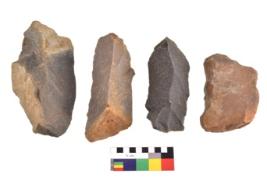 | Description / विवरण | There are n 4 utilized flake cores. There are multidirectional irregular scar pattern on both dorsal and ventral face of the flake cores. Two are tapering at one end and two have sharp edges. |