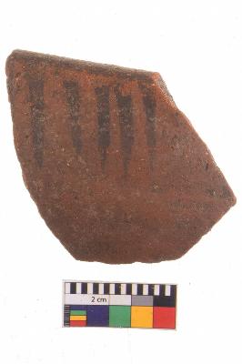 | Description / विवरण | Specimen of potsherd with black decorative geometric Linear painting, Type Black on Red Ware . |