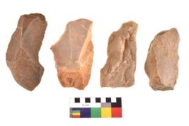 | Description / विवरण | There are n 4 utilized flake cores. There are multidirectional irregular scar pattern on both dorsal and ventral face of the flake cores. Two are tapering at one end and two have sharp edges. |