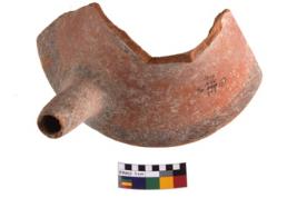 | Description / विवरण | A half broken spouted vessel; it is reddish in colour with black decorative geometric painting on it along with the bottom of spout. |