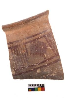 | Description / विवरण | Specimen of potsherd with decorative geometric painting. Type Black on Red Ware . |