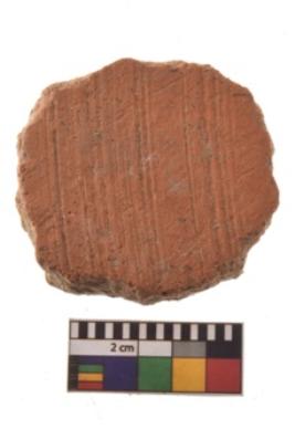 | Description / विवरण | Specimen of terracotta disc; it is irregular at the circumference and having smooth surface with recessed parallel lines. |