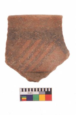| Description / विवरण | Specimen of potsherd with black decorative geometric Linear painting, Type Black on Red Ware . |