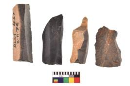 | Description / विवरण | There are n 4 utilized flake cores. There are multidirectional irregular scar pattern on both dorsal and ventral face of the flake cores. Three are tapering at one end and one has sharp edges. |