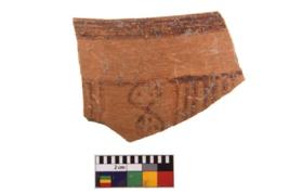 | Description / विवरण | Specimen of potsherd with decorative geometric painting of spiral design and lines. Type Black on Red Ware . |