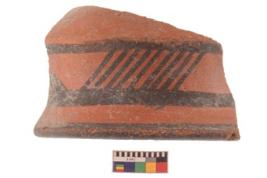 | Description / विवरण | Specimen of potsherd black on red painted pottery. It is fine fabric in sharp contrast with painted design are executed in black pigment. |