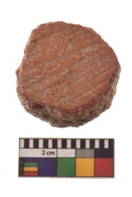 | Description / विवरण | Specimen of terracotta disc; it is irregular at the circumference and having rough surface with recessed parallel lines. |